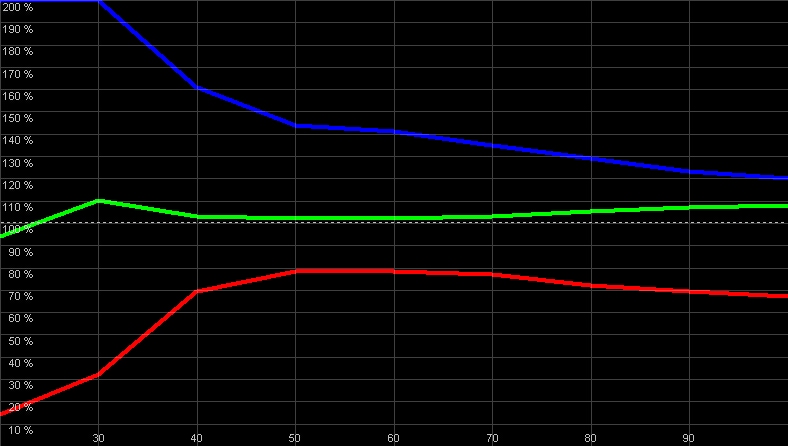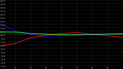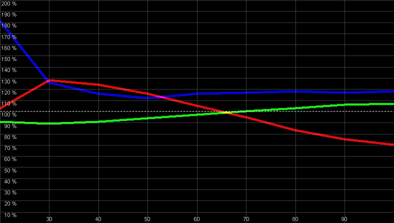 50 IRE以下偏紅, 使面色比較紅潤,光位偏藍,使白色看起來白一點,這種偏色的趨勢,