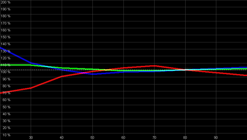 神奇地只有在30- 40 IRE中灰度有小 許, 真的非常小量,當畫面播出時, 就完全不會覺得直紋的存在。