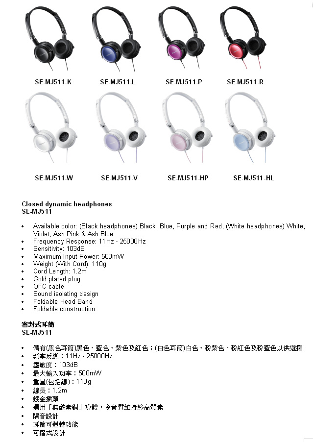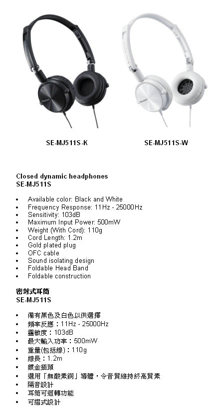 先鋒電子(香港)有限公司於2月份推出全新的密封式耳筒系列SE-MJ511及SE-MJ511S。