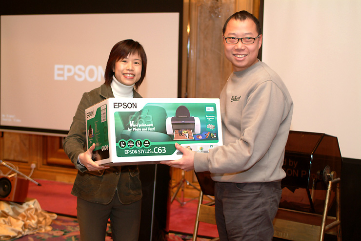 第二份獎品的幸運兒(左手面),由KEF代表頒發EPSON C63 打印機。