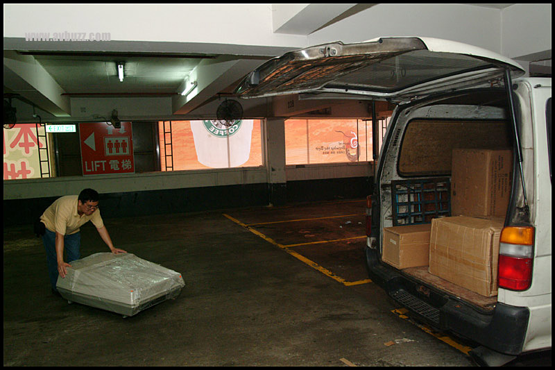 合三人之力,把Barco 1208搬上車上。