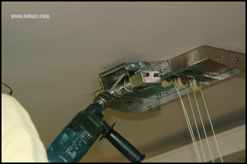 當開動電鑽時轉動的力,就代替人力,把攪盤的轉輪轉動,收緊鋼線,讓三槍機拉到天花板上。