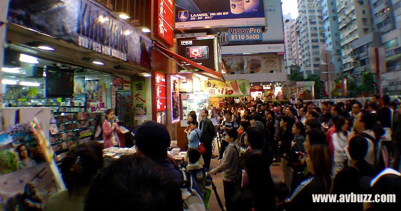 各影視店都紛紛播放KING KONG的片段,路人經過都在街上停下腳步來收看。