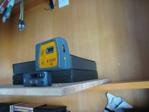 這個雷射水平儀,就是負責確保木板的孔,和天花的孔是垂直。