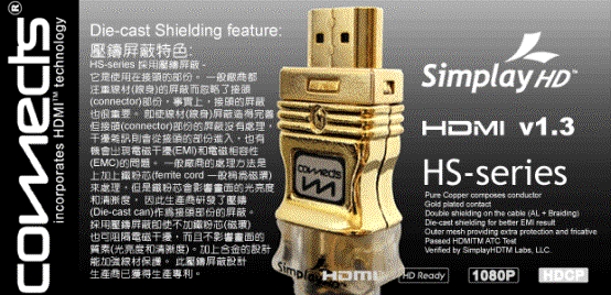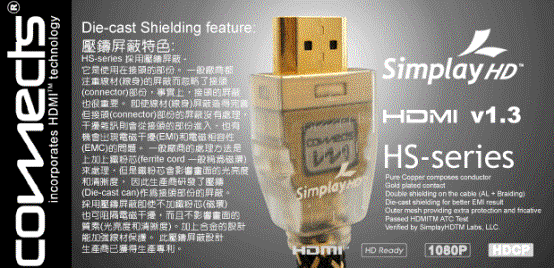 COMECTS - HS-series ¡V ¥þ·s¨t¦C½u§÷¤w³q¹L HDMI ATC ¤Î SimplayHD ´ú¸Õ¡A¥Nªí²Å¦X°ª³t(highspeed)½u§÷³W®æ¡Aµ¹®ø¶OªÌ¤@Ó«H¤ßÁʪ««OÃÒ¡C