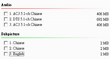 另外透過軟件的幫助,可見到這碟三條聲軌的容量,和三款字幕所佔用的空間。