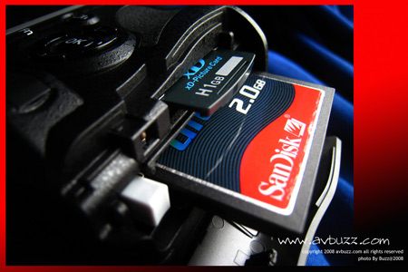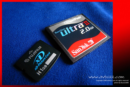 這部機屬於雙記憶卡插槽,同時支援 xD-Picture 及 CompactFlash 記憶卡。