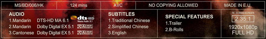 碟內提供粵語聲軌和國語聲軌,不想看字幕的香港朋友,可以聽粵語聲軌,