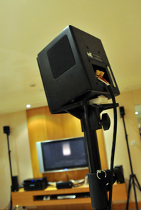 高高的放上一對MK Sound SUR24T音箱,擺放在畫面的一方,而高度比後置音箱高。