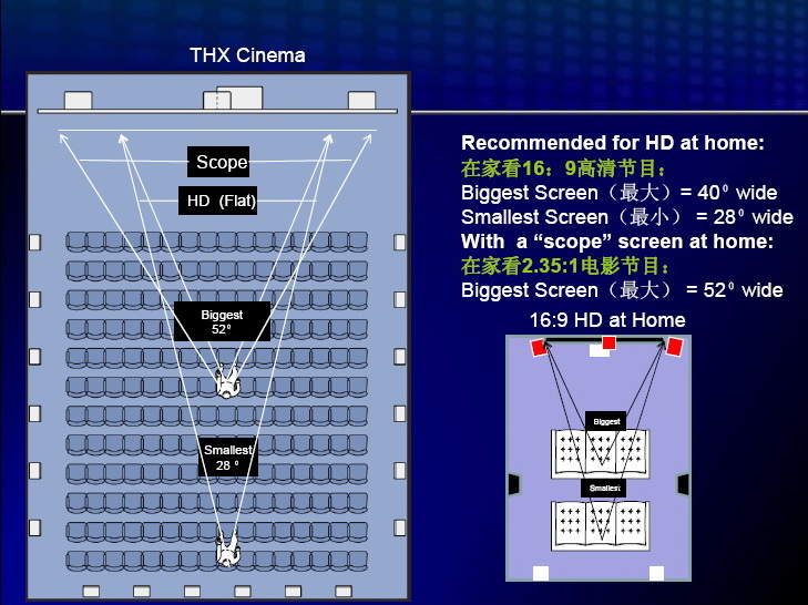 「如果用 THX 「16:9 畫面視角 40 度」作標準的話,距離為 8 呎 10 吋,然而用相同標準看 2.35:1