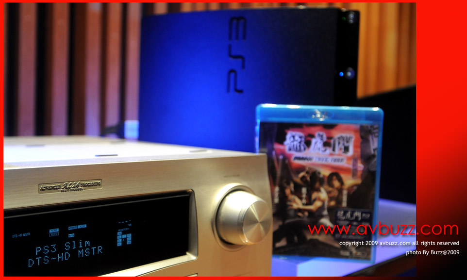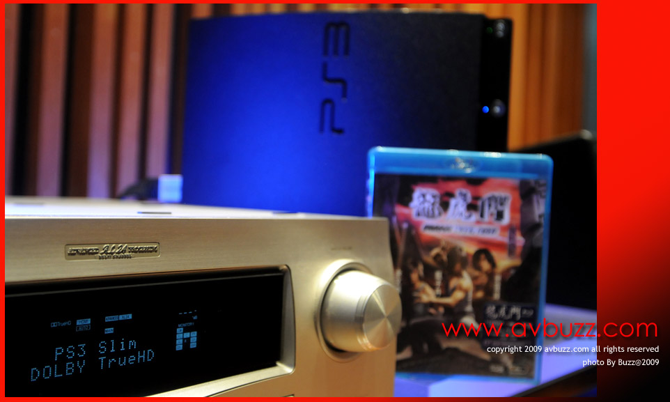 透過這個角度的 PS3 Slim 版狀態下, Denon AVR 4308 顯示屏上,可見到 DTS-HD MA / Dolby True HD 輸出字樣。