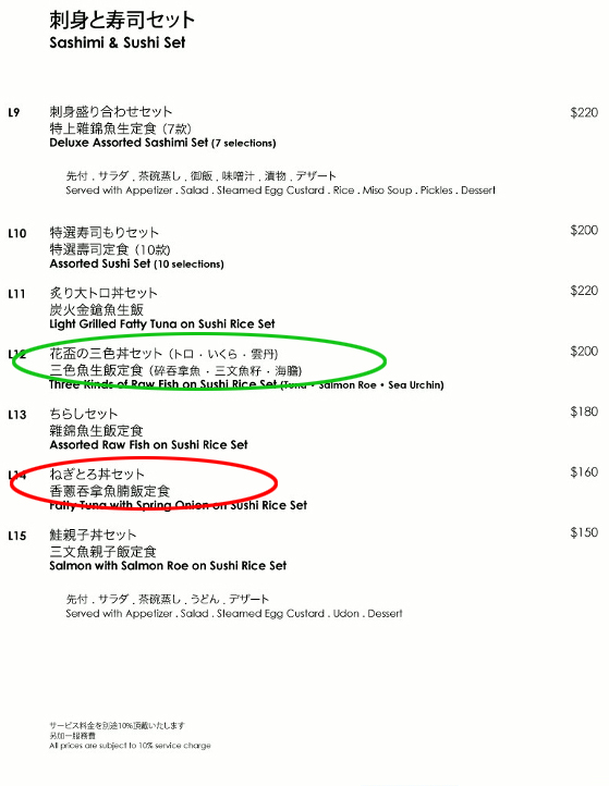 圖中菜單上,紅色圈就是 Vivica 的最愛三色魚生飯。
