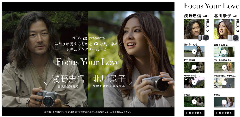 日本 Sony總公司推廣這α NEX系列相機,以 Focus Your Love 為口號,找來北川景子和淺野忠信 ( 電影蒙古王男主角),