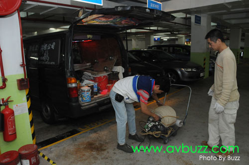 光哥在工程車上把今日所須用的工具,用手推車運上樓。