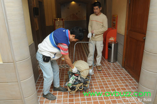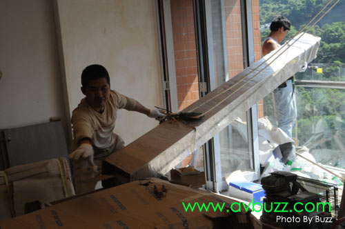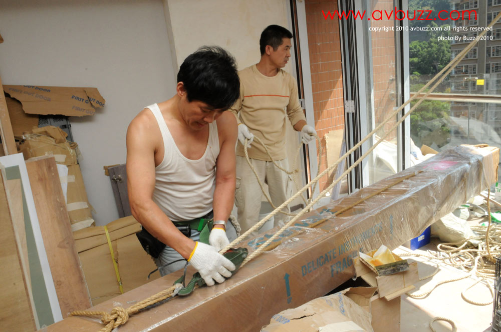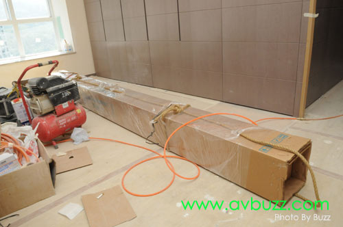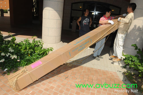 但沒有想到這座大廈,無論是樓梯或電梯,就算是不要包裝,都是不能容納這枝幕的長度。