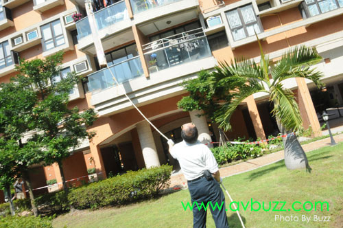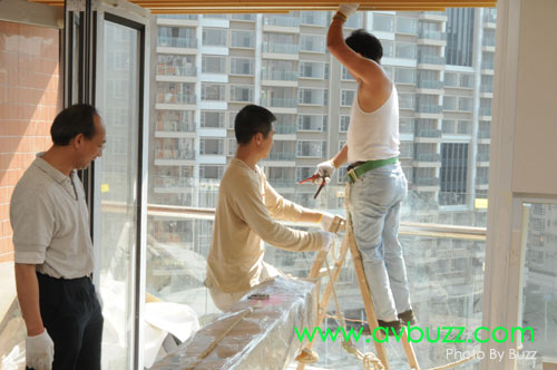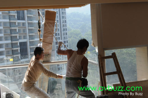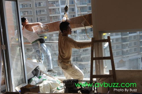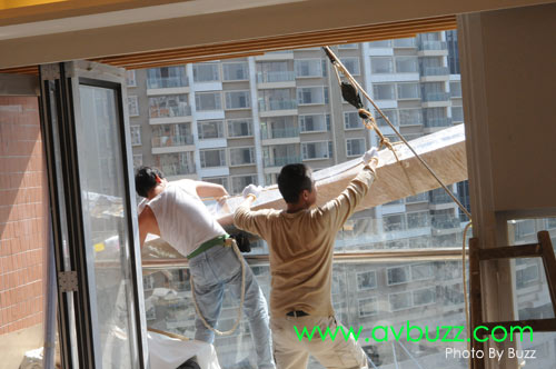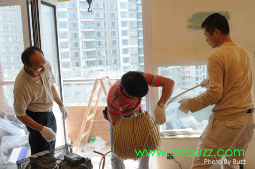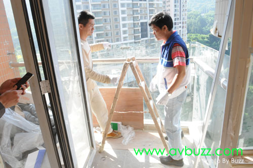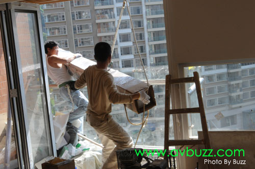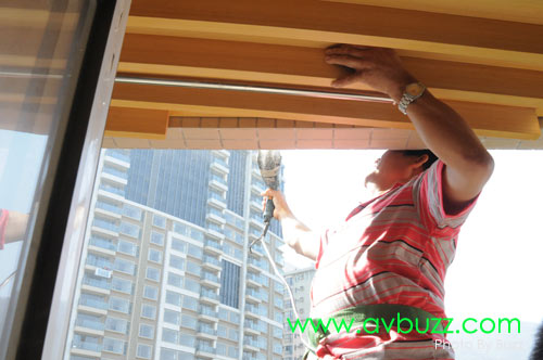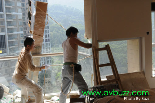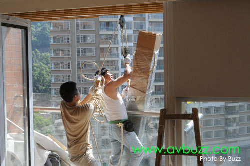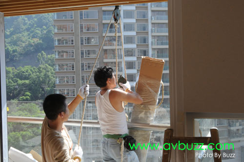 唯一解決方法,就是把投影幕由戶外地面吊上16樓,穿窗入屋。