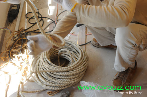 在光哥努力為投影幕打繩結時,