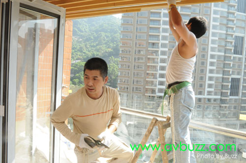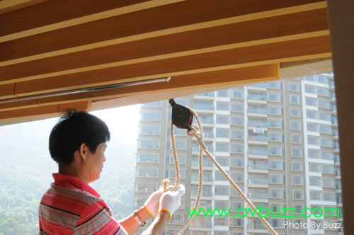 由於玻璃欄杆高度關係,光哥可發力的角度有限,加上投影幕的摩打正是光哥這一邊,所以光哥要用力多一點。