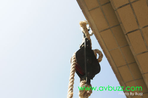 在16樓的光哥和助手,就出力的拉,光哥所用的滑輪,是 2:1 方式,他拉 2呎繩,幕就被拉動 1呎。