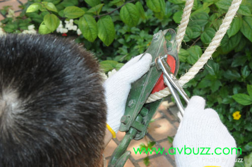 把滑輪扣上,試拉一下,確保沒有問題之後,只留下一位助手在下面工作。