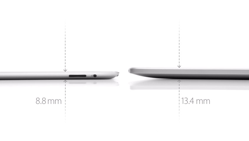 厚度由原本的13.4mm減少到 8.8mm ,比 iPhone 4更薄,而重量方面,由1.5磅減少到1.3磅。