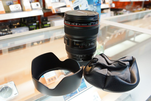 發泡膠內一共有三件東西擺放著,分別是遮光罩,鏡頭索袋和一枝 24-105mm f4L 鏡頭。