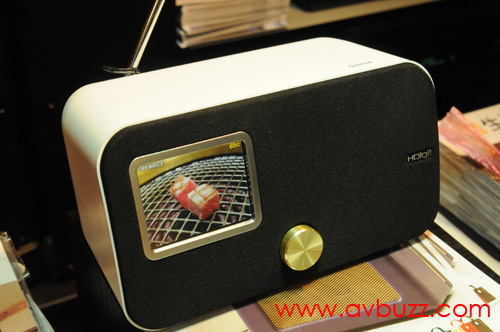 透過圖中可見,這款數碼收音機,屏幕正在顯示一家食店的硬照廣告中............