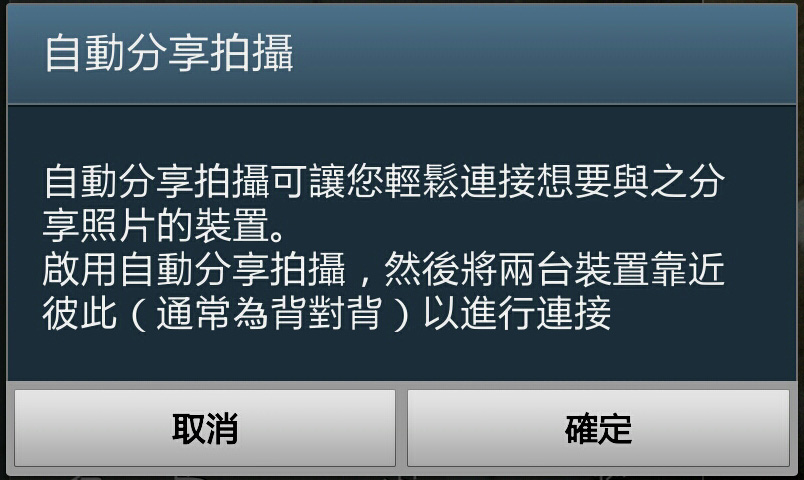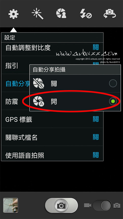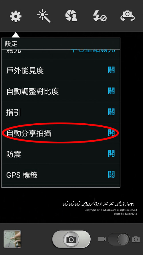 首先如圖在互相的相機功能內,把如下圖所見的 自動分享拍攝 這項功能開啟。