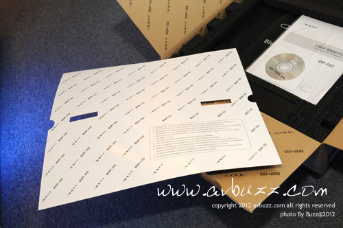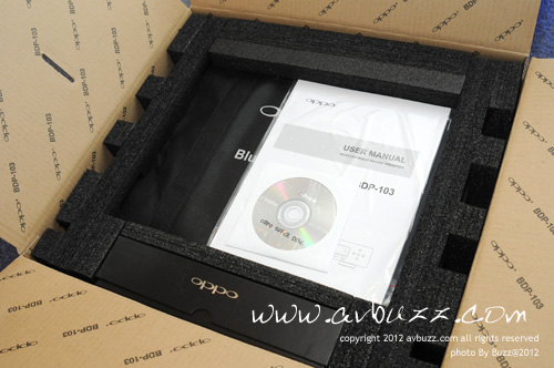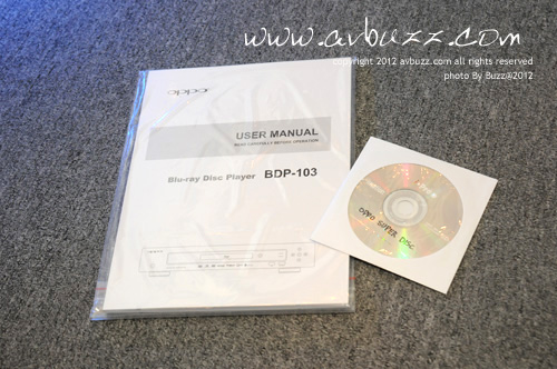 把面層的圖紙移走,可以見到一整本的英文說明書和一隻上次都有的DVD全區碼光碟。 中文說明書會在容後推出,各位有需要人仕,到時可上網Download又得,直接上來聲耀全音旺角陳列室取印刷品都得。 如果心急想睇睇這本英文說明書,可 Click 以下一步到位的網址,Download來看看。 http://download.oppodigital.com/BDP103/BDP-103_User_Manual_English_v1.2.pdf 而這隻DVD全區碼碟,跟上次 93 和 95 屬同一隻碟內容,用家如果失去了這隻碟,上網取回昔日的檔,一樣可以做到DVD全區碼功能。 使用方式和昔日一樣,用家只需放入碟就可以等收成。