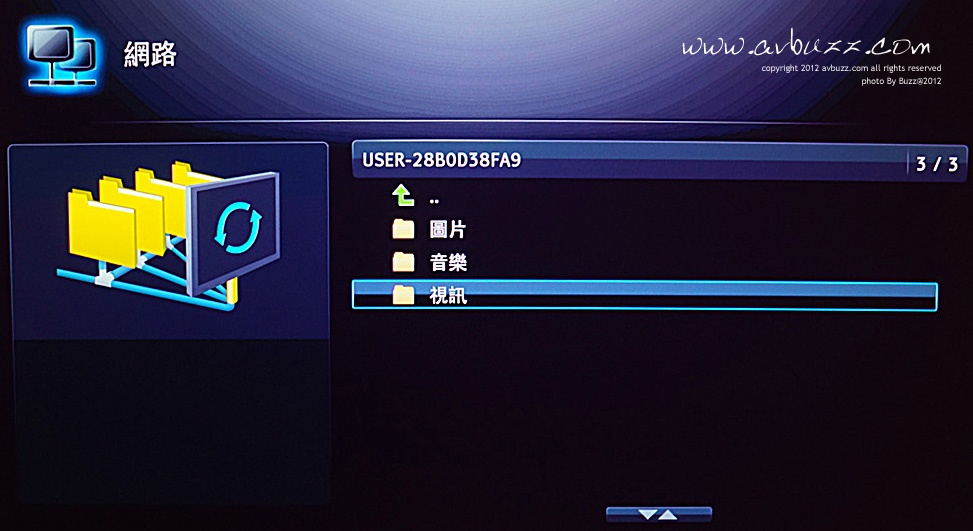 自己分类 用家无论系挑选Mac或PC,只系需要选那一部电脑,BDP-103 都会出现如下图这三个资料夹出来, 容许我长气一点,这三个资料系由 BDP-103 原生出来,三个资料夹图片,音乐 和 视讯 这字眼, 系由BDP-103 原生出来,绝对唔系我打出来的字。 无论我知定唔知,喜欢定唔喜欢,总之一选好某一部电脑,佢出现第一个画面,就系呢三个资料夹。 三个资料夹无得加多,也无得减少,用家更不需要自己拖边一D档案去某某地方先睇到。 因为用家早在第一步,不就是选了该部电脑了吗? ( 当然如果系都要指定去某一个位置都得,识果个唔需我讲都知点做, 但唔识果个就会比我吓亲路,又话咁又话咁,以为呢部机好恶搞添 ) 再简单D讲,三个资料夹的性质,完全由 BDP-103 自己来分类,例如好以似我咁门外汉, 我真系唔识得分MOV档,究竟系属于图片档,定音乐档,还是视讯档?咁我点识分类呢? 总之就系交晒比 BDP-103 自己来分,用家只需要话比自己知,依家想睇图片,定想睇Video, 还是想听歌,想边个就进入边个资料夹内就可以了,唔好想得太复杂。 例子 : 要找七姑姐结婚的影片,依然是要靠 F: \ ( 2012 ) \ ( 家庭 ) \ ( 节日 ) \ ( 七姑姐 ) 这条路径去找。 只不过这条路径平日是在电脑上走,现在是于 BDP-103 走吧。 待续................