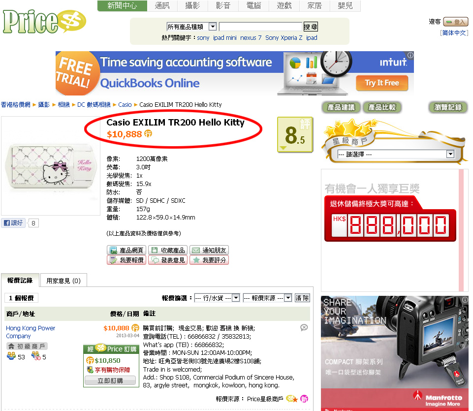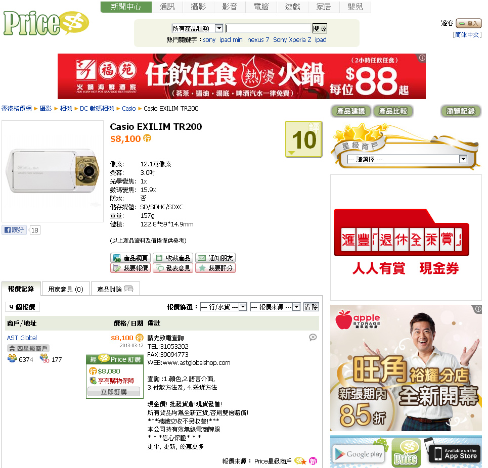 被稱為女生自拍神器的 Casio EXILIM ,最新型號 TR200 抵港,售價居然達到 $8100 , 在我眼中只係值 $3000樓下的呢款機,居然可以賣到咁貴,所以話我網底蛙真係無錯, 呢個價錢,單鏡反光機都買到喇~~~~ 貴 ? 未算!!!!!!!