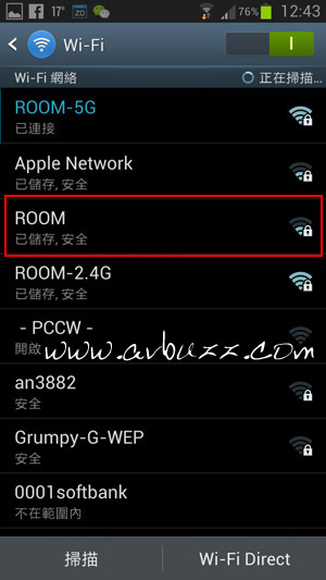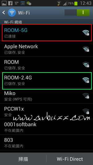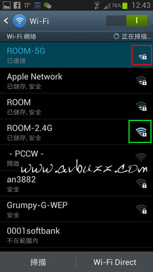 圖中名為 ROOM 的 Wi-Fi,正是家中舊 Router 的訊號,當我身處睡房床頭時, Wi-Fi訊號雖然未算得盲點,但是比較弱,看看只得兩格。 但反觀由 Netgear R6300 所產生出來 ROOM-5G 和 ROOM- 2.4G Wi-Fi訊號就強得多了。