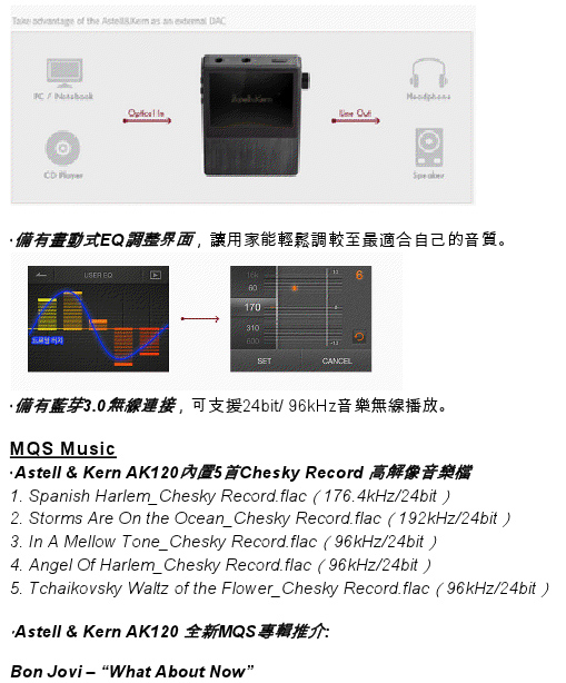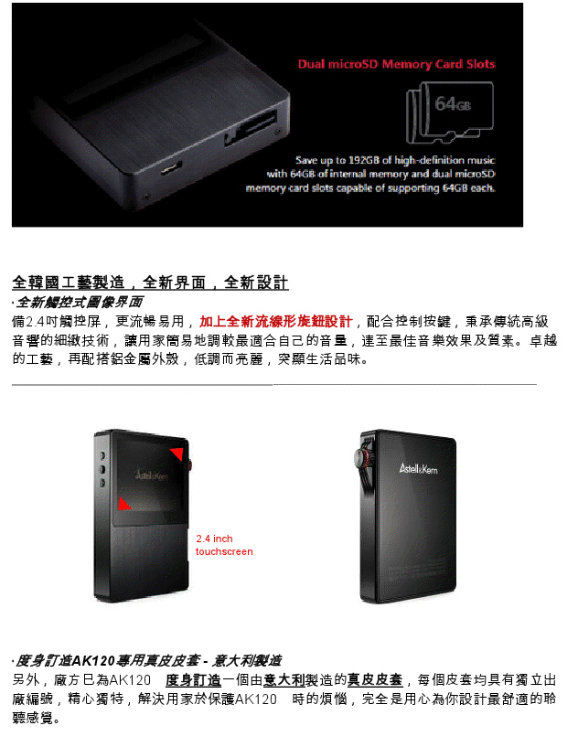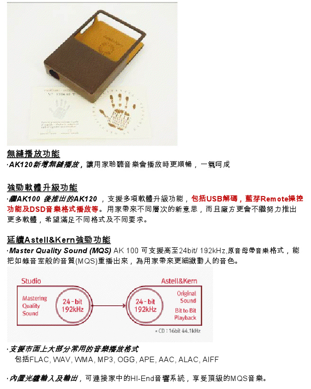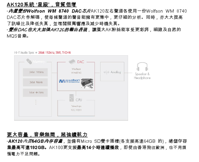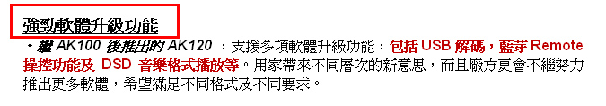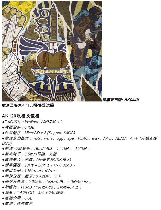新舊機差價接近一倍,有乜野唔同? 首先就係AK120支援讀取 DSD音樂檔案,嘿!!!!淨係呢點都足夠晒你冷,市面上大機都唔係咁多部可以,可況流動裝置? 至於舊機都讀到的 24bit/ 192kHz ,無奶油新款唔得下嘛,成萬銀喎~~~ 另外,舊款得一份 Wolfson WM 8740 DAC芯片,今次打孖上,左右聲道各用一份。 新款還有 USB 解碼的設立,雖然用家未必真係會用,但有總好過無。 不過新聞稿裡的字眼要留意一下,這是否代表下星期第一時間取得的版本,還未有這些功能,需要等升級韌體,方能擁有呢? 這點就需要真係有機先可以試到了,就咁照字面解就係啦。