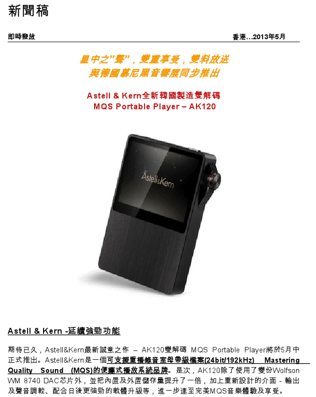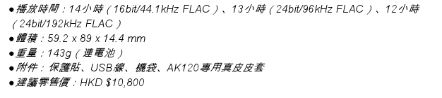 今期最紅係佢啦~~~剛剛收到AK120新聞稿,睇完對呢部機有進一步了解, 首先就係明碼價錢曝光,比舊款 $5680 貴近一倍,係 $10800 港元,月中有貨 ( 豈不是下星期 ? ) , 問過有份接受預訂的 旺角聲耀全音,他說代理目標希望下星期尾派貨。