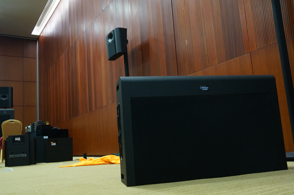 低音炮在家庭影院來講,對於整體效果是一個非常重要關鍵。 圖中所見是剛剛擺放低音炮時的位置,可見兩隻雙 18"低音炮,分成一左一右,擺放在透聲幕下面。