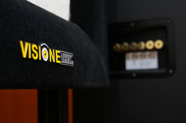 VISIONE 透聲幕 投影幕方面,是用上來自英國的 VISIONE 透聲投影幕,她是屬於編織幕料,好處是近距離也不易見到透孔。 而事實上這幕也取得 THX 認證。 透過實地 Cymie 身軀做比例,可大約猜想到這隻 215 " 16:9 幕實物大小。