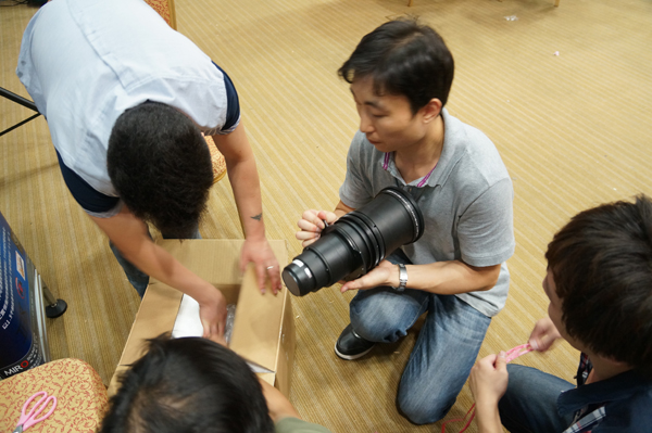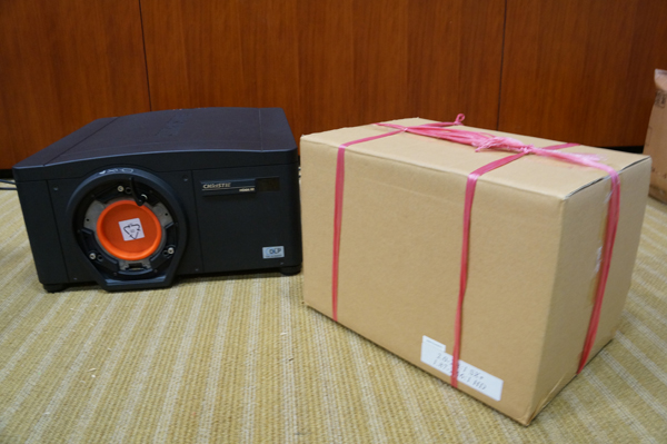 這部機運送來會場時,是身首異處的, 工作人員先把投影機身軀先擺放好在工作台上。