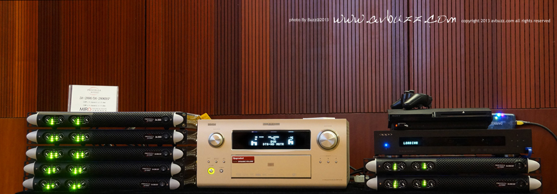 Procella Audio DA-2800 前級選用 Denon AVP-A1HD ,當日用圖中所見 7 部 DA-2800 後級來推動全場 Procella Audio 9.2 音箱 。 位於圖中右手邊的兩部 DA-2800