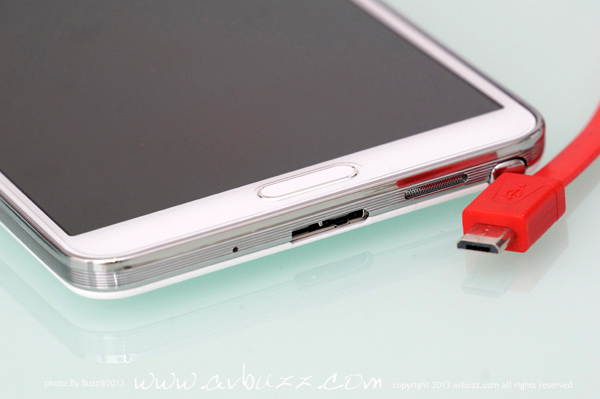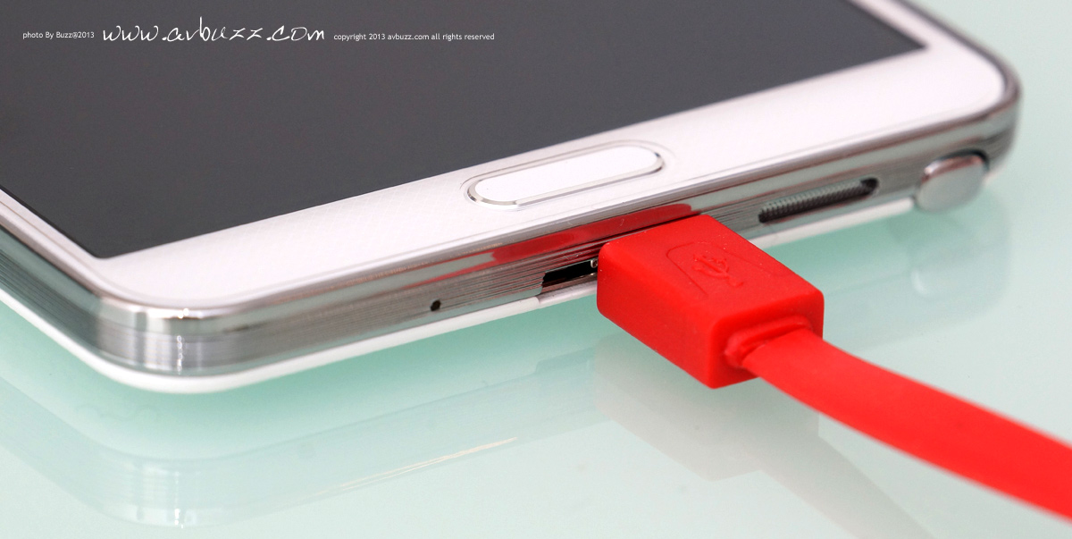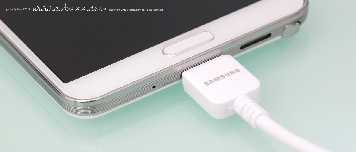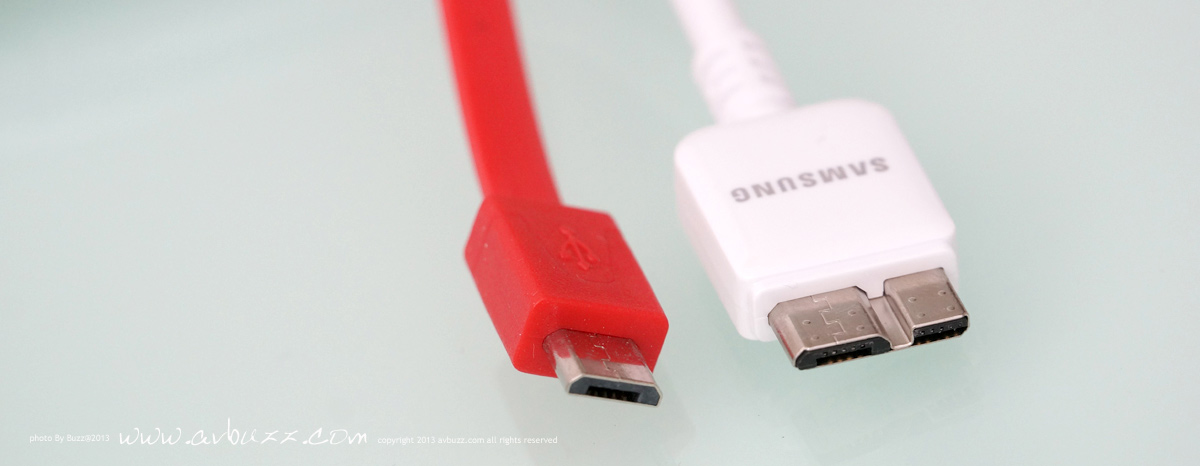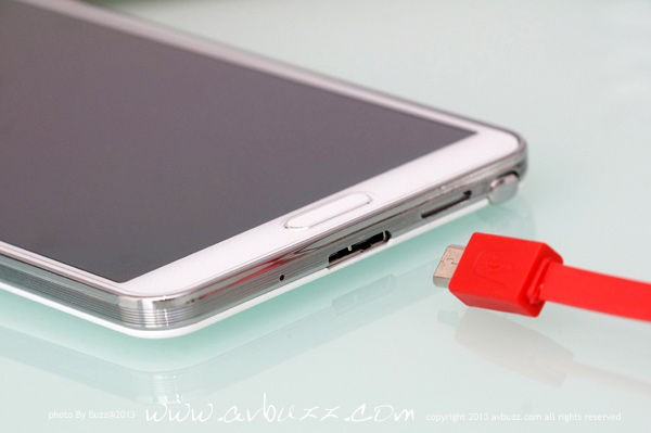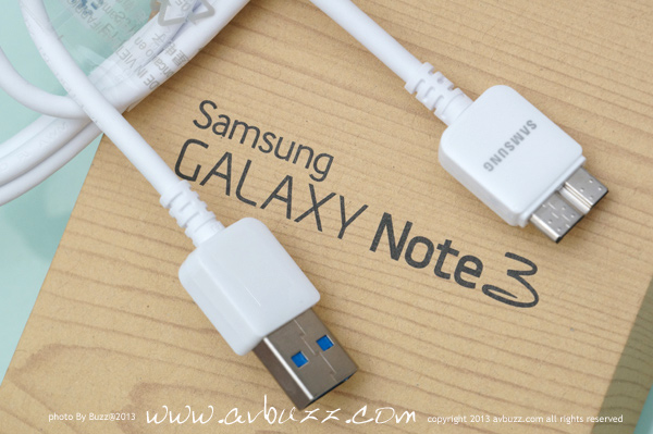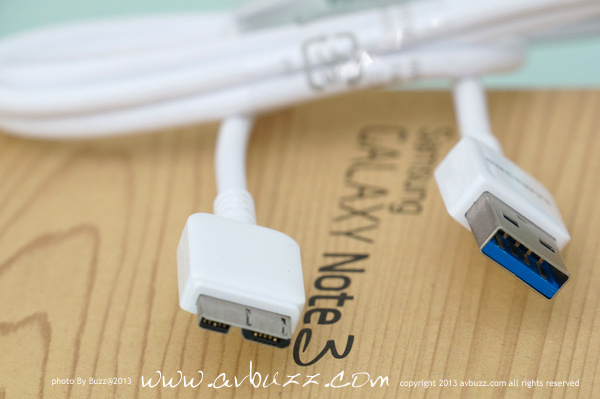 USB 3.0 呢部機可拍 4K 影片,影張相都成千萬像素,如果傳輸得慢都幾死, 可能因為呢個理由,今次Note 3的USB接口是用上了 USB 3.0, 頻寬達 5Gbps 的 USB 3.0 ,相等於USB 2.0高速模式 480Mbps的10倍速度, USB 2.0傳 50GB 要用半個鐘,USB 3.0 只用 6分鐘就搞惦,你話喇~~~ 圖為跟機付上的 USB 3.0線材,這個接頭,有別於我們平日所見 USB 2.0 插口樣子.................