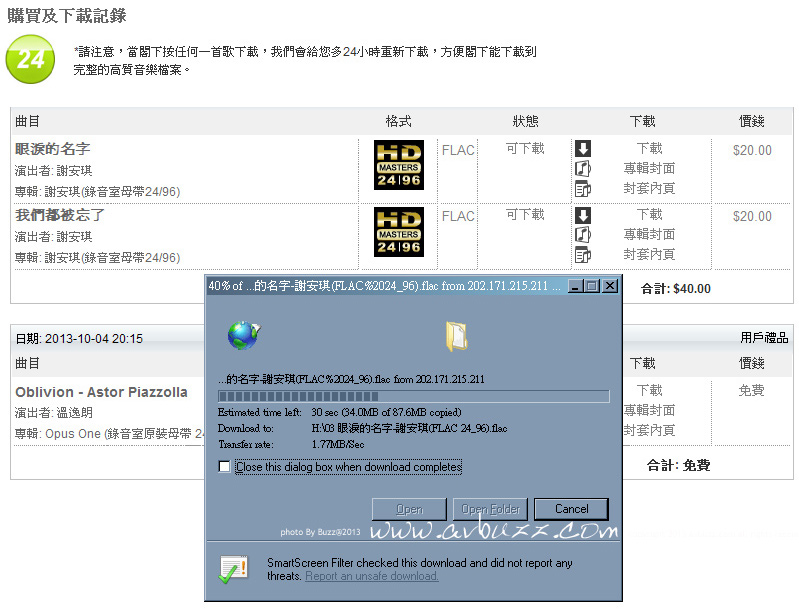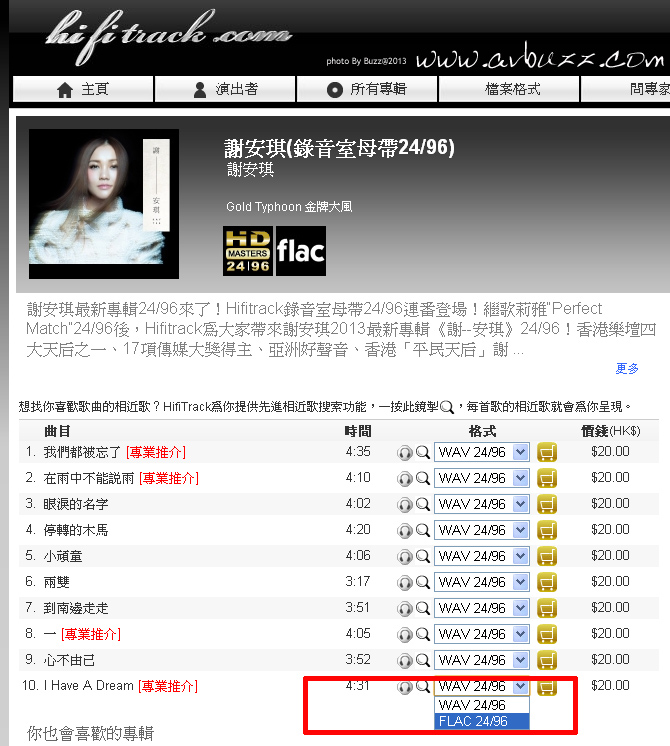 錄音室母帶 24bit 96kHz 唔喜歡 CD 碟的朋友,除了光顧 iTunes Store外,也可透過 Hifitrack 網上購買錄音室母帶 24bit 96kHz 檔案, 格式方面,可選擇購買 WAV或 FLAC ,每首歌曲檔案港幣 $20 ,買一首歌都得。 以下就係官方購買檔案的網址 : http://www.hifitrack.com/node/27399 到步後可見到收錄在謝--安琪專輯裡的10首曲目,一律提供 24bit 96kHz 檔案購買。 單買一首又得,全選更歡迎吧,購買時留意每一首歌曲,都提供如圖所見 WAV或 FLAC 選購。
