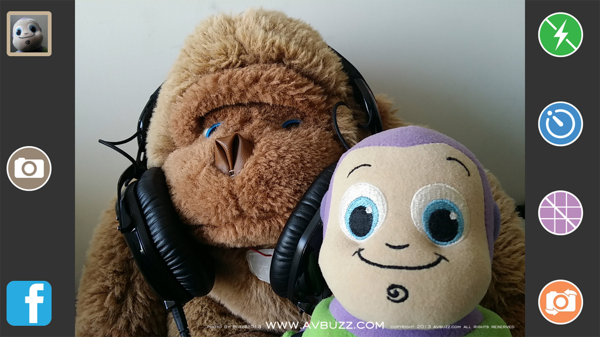 下圖為 Easy Shot 這個 app在手機上出現的主觀畫面,自拍時就係咁樣了, 用家雖然手執搖控,但依然可以改變主意用觸屏方式影相,成像後更可立即一步到位地發放到Facebook去。 右手邊的操作鍵,由上至下,分別係開關閃燈切換,2秒和10秒自拍切換,格線切換,還有前後鏡頭切換。