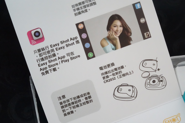 把背蓋向下推開後,可以見到 CR2032 鈕形電,是 Easy Shot 電力來源。 所提供能源約可按 1萬次。