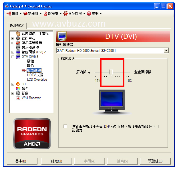 理論上係自動對應到100%填滿畫面,但電腦野,時有失靈是常識吧。 萬一見到個直Mon畫面並無自動填滿畫面,咁就要手動做修正喇, 左圖所見的縮放選項,會見到預設唔識得去畫面掃描,所以靠人手把個鍵如右圖所見,推返去全畫面掃描,咁就解決了有關問題。 點解我咁清楚,好明顯我咪係那個當事人囉 ~~~~>.<~~~~~
