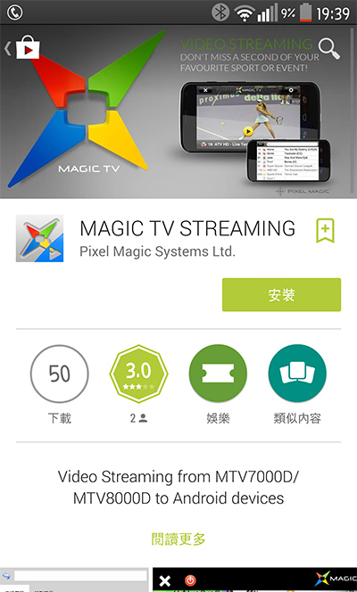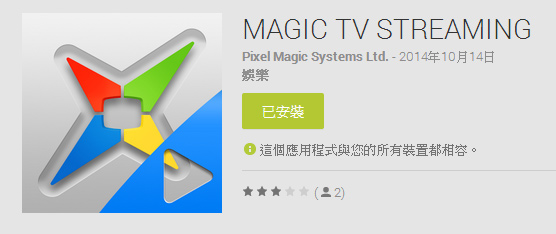 不過跟 iOS版一樣,這個串流播放器,都係有很多改善空間,尤其快速搜畫基本上等同無效, 點對點播放無問題,但一搞親個畫面就要Load一大輪,只能稱為忍受使用,不過免費 app 咪用住先囉。 如果仲未安裝,可到以下網址得到。 費用全免 https://play.google.com/store/apps/details?id=com.magictv.pixelmagic