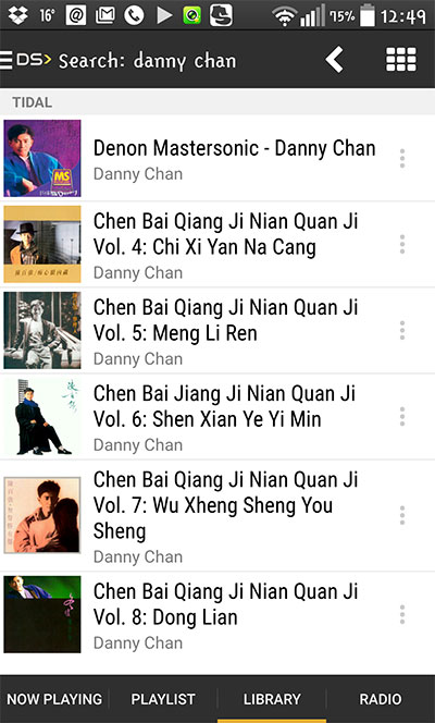 TIDAL 講完 LUMIN ,轉下話題,TIDAL 所提供音樂庫內中文歌,無論是歌名,或是歌手名稱,都是以英文方式存檔。 搜尋中文歌,要輸入英文,陳百強,鄧麗君,張國榮..........通通要用英文名先能找到。 所以在 BubbleDS Next 這個 app,所出現中文問題,千萬不要誤會是 app問題,是 TIDAL 音樂庫問題。 就算是用 TIDAL 官方所提供app,依然是因為音樂庫本身問題,中文歌只能以英文顯示。