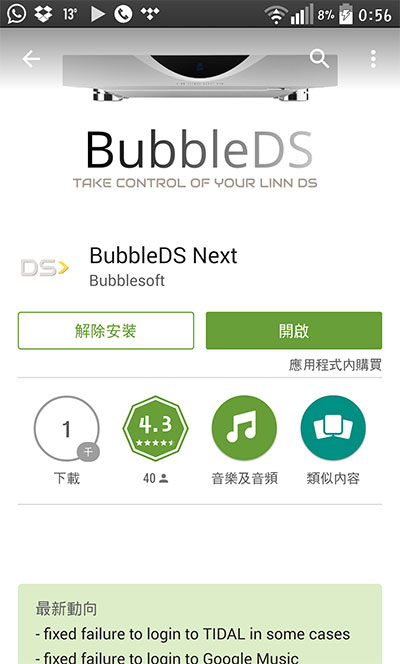 代用 app LUMIN 擁有自家強勁 App ,對應 TIDAL 功能還在趕工製作中,暫時未能使用,那..........就算更新手上靱體,豈不是得物無所用? 幸好臥底發現 android 提供一款名為 BubbleDS Next 的 app ,能配合 LUMIN 即時對應 TIDAL。 把 LUMIN 靱體升級後,利用 android流動裝置配合這個 app ,就可立即玩到。