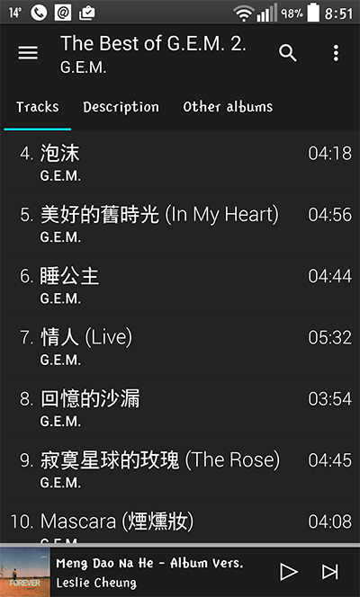 一直以來我最喜歡的 G.E.M.,在我自己音樂庫,都是以 G.E.M.命名,而唔係鄧紫棋, 輸入G.E.M. 自然一擊即中,哈~~~~幸運是她的歌名,都是以中文顯示,而並不是英文,太好了~~~