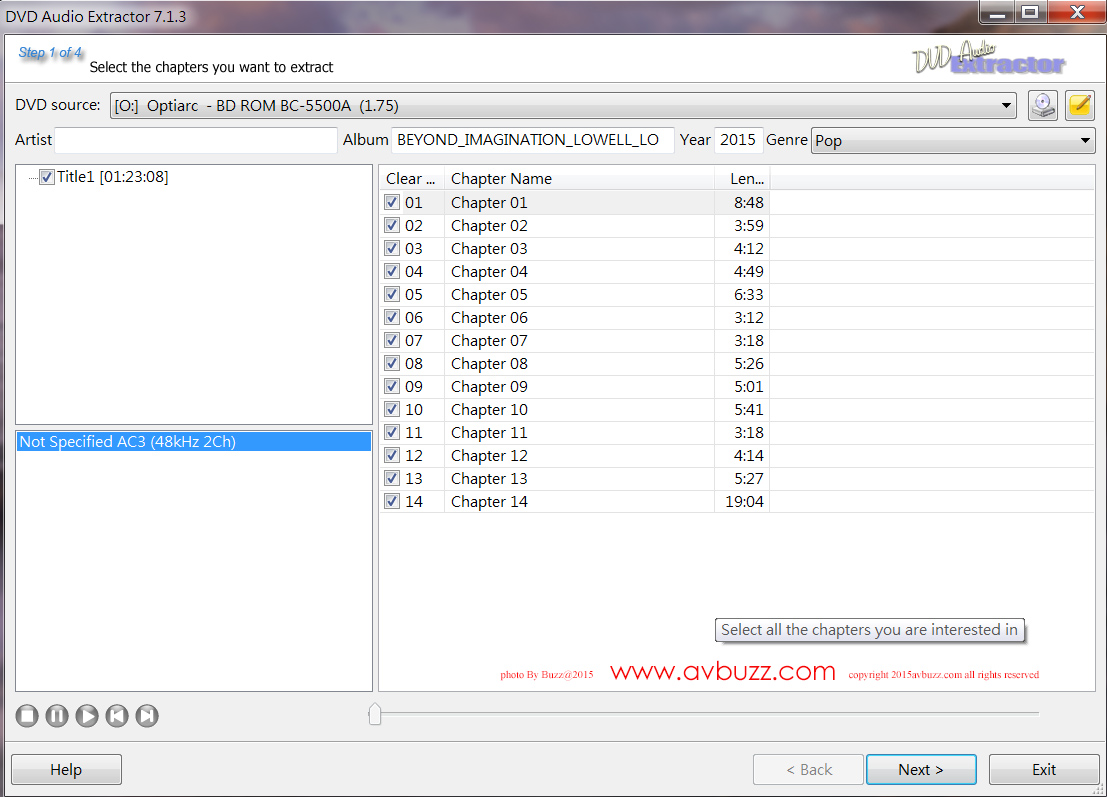 14條聲軌 抽取DVD聲軌出來有很多不同方式,我自己就利用 DVD Audio Extractor 來做。 這 DVD 裡收錄13首曲目,連同製作特輯是 14 條聲軌。 透過 DVD Audio Extractor 這軟件,可見有關聲軌的基本資料。