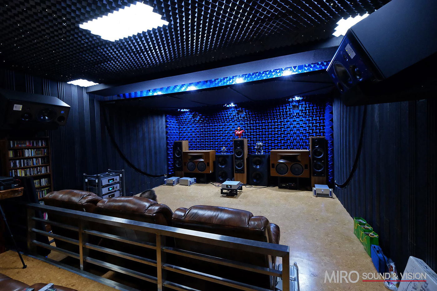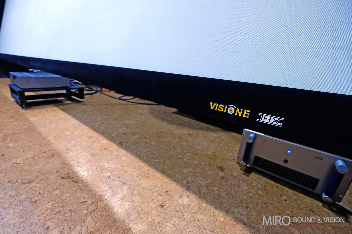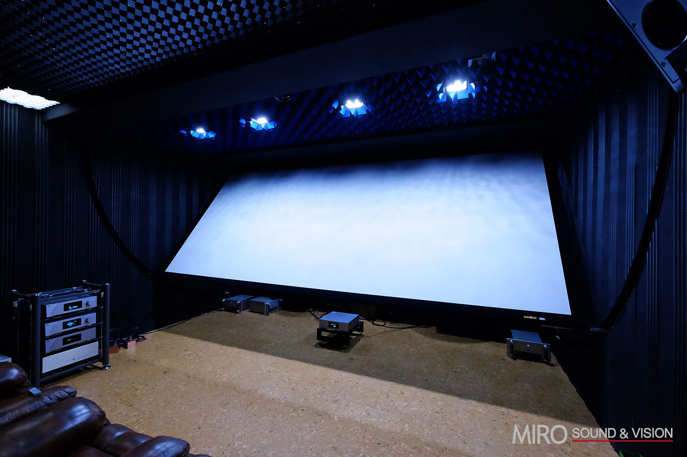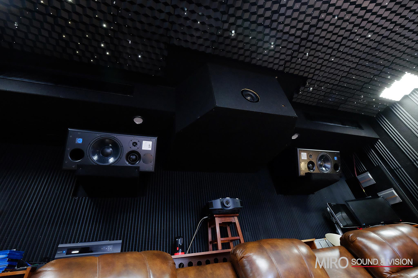 器材影音分家下,正牆同時擺放了兩聲道與家庭影院喇叭, 下圖所見,是工程完成後,梗幕被收起的狀態。