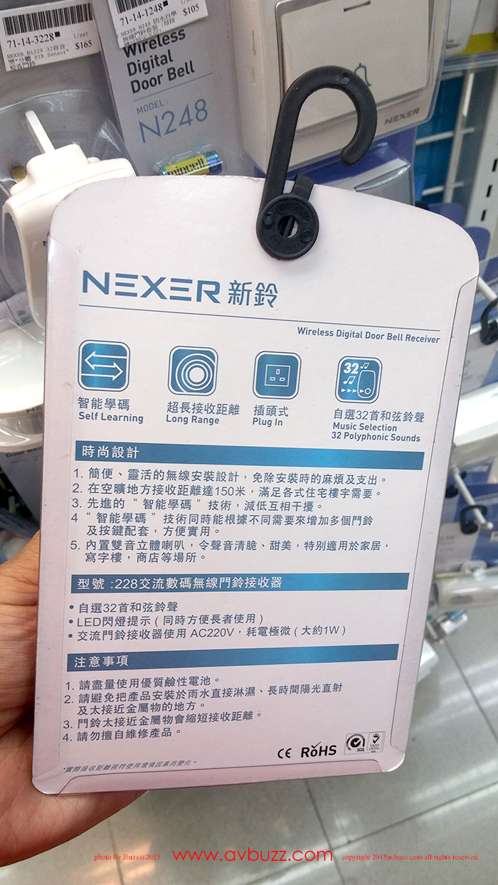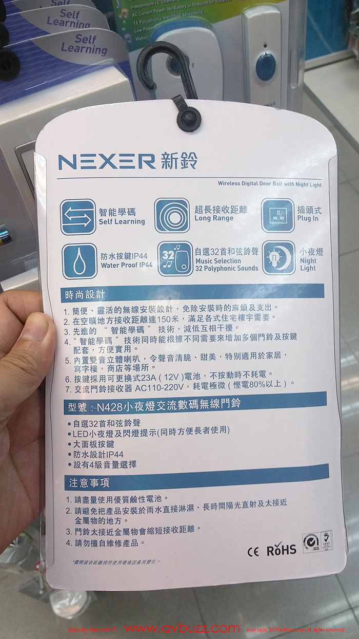 下圖所見,這款就是 Ricky Lee 所講入的 ( NEXER 新鈴牌 ) 無線門鈴,她是一對包裝,分為按鍵門鈴與閃燈發聲接收器。 背面簡介裡可見無線接收範圍是空曠地方150米,在 Ricky Lee 實地使用在擺放遠處,而且隔著密閉隔音房都無問題。